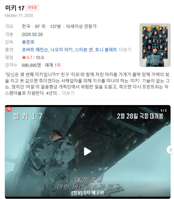 드디어, 세계가 기다린 봉준호 감독의 신작 《미키 17》(Mickey 17) 이 2025년 2월 28일 전 세계 동시 개봉했습니다.